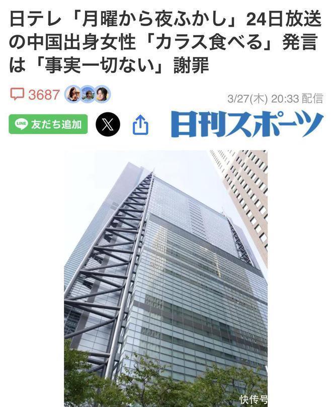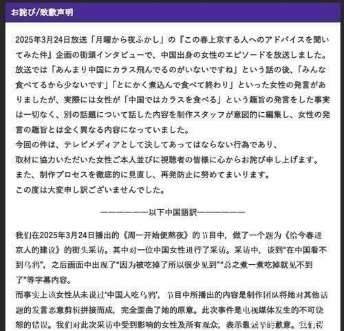327日,日本电视台就“于324日播出的日本国民级综艺《周一开始便熬夜》节目中的对中国籍女性街头采访内容”发布致歉声明。